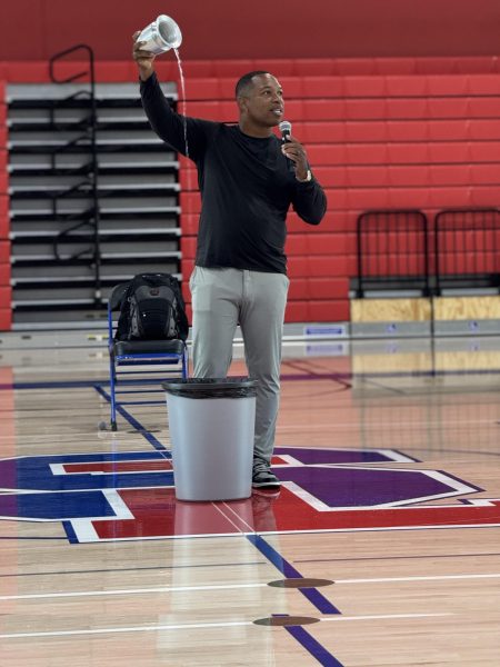 Hawkins, an international speaker, looked out to the students while giving a motivational speech. He drew stories from his past to deliver motivational messages inspiring students to never give up. He shared that he didn’t give up when he had to step up around the house as a kid in order to help his mom.